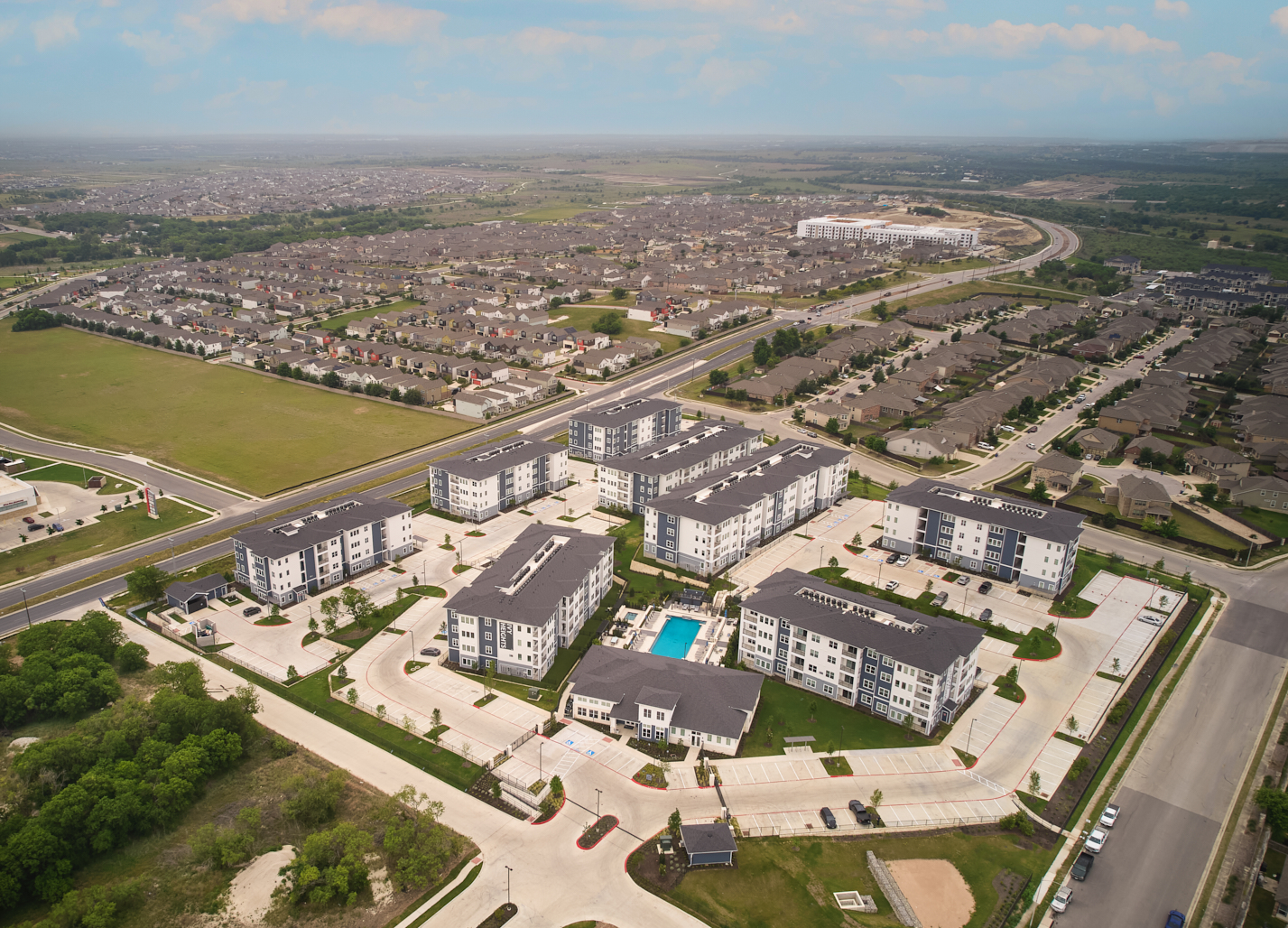 The Easton Park Apartments were completed in 2025 and consist of 300 units spread out across 8 four-story apartment buildings. The mixed-income property offers both affordable and market rate units and a variety of open floor plans with contemporary cabinets, granite countertops and tile shower surrounds. Amenities include a resort style pool with fountains, shade structures, a fire pit, BBQ area and beautiful recessed step lighting throughout. The spacious clubhouse provides a business center and lounge space as well as a large fitness and yoga room.